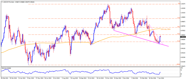USD/CHF While another bounce from four month old descending trend-line support propelled the USDCHF towards marking fresh fortnightly high, 50% Fibonacci