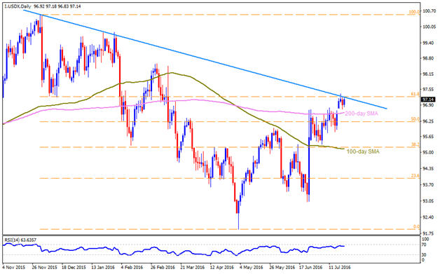 Although market players’ recent-run for the greenback helped the US Dollar Index (I.USDX) to surpass 200-day SMA for the first time in four-months, the gauge struggles around a downward slanting trend-line stretched since December 2015, which together with the 61.8% Fibonacci Retracement of its December 2015 – May 2016 decline, near 97.30, holds the immediate Bulls captive. Given the index surpasses 97.30, it can quickly rise to 97.80 & 98.00 resistances, breaking which 98.60 & 99.00 are likely upside numbers to be seen on the chart. Further, the greenback gauge’s additional advances beyond 99.00 needs to confront with 99.80-85 before challenging the 100.00 psychological magnet. On the downside, a close below 200-day SMA level of 96.60 can quickly drag it to 96.00 & the 95.50 ahead of visiting the 95.20-10 support-zone, including 38.2% Fibo and 100-day SMA. If at all the index declines below 95.10, also clears 95.00 round figure, chances of its 94.00 re-test can’t be denied.