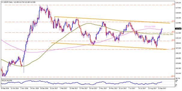 USDJPY’s reversal from 107.30 presently helps the pair to trade beyond 200-day SMA for the first-time in more than two months; however, it is necessary for the quote to register a daily closing above 112.20 SMA figure in order to aim for 113.60 and the resistance-line of a broader descending trend-channel, at 114.00 now. Given the pair’s successful north-run after 114.00, the 114.50 and the 115.50-55 might entertain buyers before pleasing them with 116.00 round-figure. Should prices fail to sustain recent strength and close beneath 112.20, the 100-day SMA level of 111.10, followed by 110.60 and the 110.00, might become nearby supports to observe. Moreover, pair’s additional weakness post-110.00 break can have the 108.60 and the 108.00 as intermediate halts prior to igniting the importance of the channel-support number of 107.25.