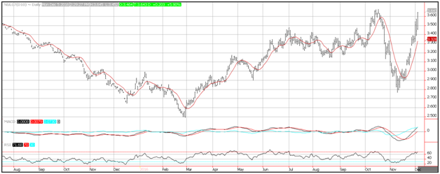 Prices are poised to test resistance near the 3.66 level and a break of this level would lead to a test of the November 2014 level near 4.55. Momentum remains positive as the MACD (moving average convergence divergence) index prints in the black with an upward sloping trajectory which points to higher prices. The RSI (relative strength index) moved higher with price action breaking through the 70 level which reflects accelerating positive momentum. The only caveat is that the current reading of 72, is above the overbought trigger level of 70 and could foreshadow a correction.