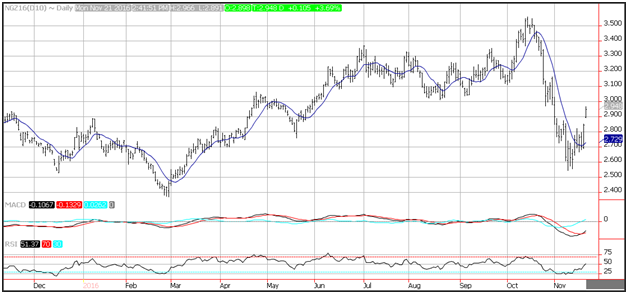 Price gapped higher and are poised to test resistance near former support at 3 per mmbtu. Support is seen near the bottom of the gap at 2.85, and then the 10-day moving average at 2.73. Momentum is positive as the MACD (moving average convergence divergence) index generated a buy signal. This occurs as the spread (the 12-day moving average minus the 26-day moving average) crosses above the 9-day moving average of the spread. The index has crossed from negative to positive territory confirming the buy signal.
