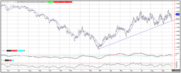 Natural gas prices have turned lower on Friday following a report from the National Oceanic Atmospheric Administration that showed that Hurricane Matthew is projected to head north east over Jamaica, and miss the Gulf of Mexico. The gulf is where many production facilities are in the U.S. and a miss will avoid disruptions. Support is seen near an upward sloping trend line that connects the lows in March to the lows in September and comes in near 2.88.