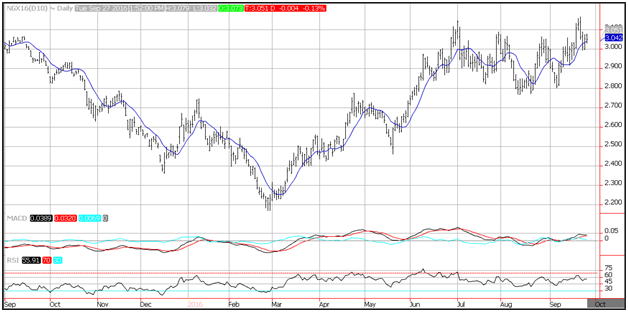 Natural gas prices were nearly unchanged and remained at elevated levels as trader’s attempt to estimate how the current weather scenario will affect prices.  The National Oceanic Atmospheric Administration continues to forecast warmer than normal weather throughout most of the United States, while also reporting colder than normal weather throughout most of the western portion of the United States. Support is seen near the 10-day moving average at 3.04, while resistance is seen near last week’s highs at 3.16.