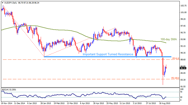 Having dropped from the 89.50-30 horizontal support, AUDJPY plunged below 61.8% FE and 100% FE of its November 2014 – February 2015 decline; however, a bounce from the lows, near 82.00 round figure mark pulled the pair back to its 86.50 area, signaling 88.60-70 region, should it manage to hold the recent up-move intact. Further advance beyond 88.60 area likely to be capped by mentioned support now turned resistance region, 89.30-50 while a sustained break of which negates pair’s chances of near-term declines, fueling it towards 92.00 round figure mark prior to testing 100-day, presently near 93.00 level. Alternatively, 85.50 is likely level that could again trigger pair’s decline towards first 84.00 round figure mark and then to the recent lows near 82.00 level. Moreover, continued declines below 82.00 can make the pair vulnerable to plunge below its 80.00 psychological magnet.