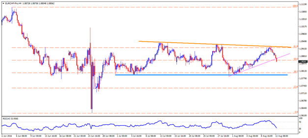 EUR/CHF EURCHF’s repeated failures to clear a month-old downward slanting trend-line dragged the pair prices below a short-term ascending trend-line