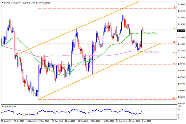 Following last weekend’s disappointing NFP, the US Dollar dropped against all its counterparts and the EURUSD, being no exception rallied to nearly a month’s high by surpassing the 50-day SMA. However, Monday’s profit-booking restricted the pair from extending its north-run, which then was carried forward on Tuesday when the pair is likely reversing towards re-testing 50-day SMA level of 1.1315. Given the pair drops below 1.1315, the 1.1240 and the 1.1215 likely small barriers for its clear before visiting the 38.2% Fibonacci Retracement of its December 2015 – May 2016 upside, near 1.1200 round figure mark. Moreover, pair’s further decline below 1.1200 can drag it to 1.1130 and then to the important 1.1100 support confluence, encompassing 200-day SMA and support-line of broader ascending trend-channel. Meanwhile, 1.1385 and the 1.1400 are likely nearby resistances that it could witness during its immediate U-turn, breaking which 1.1445, 1.1465 and the 1.1500 are expected numbers the pair might print on the chart. Should it manage to clear 1.1500, chances of its rally towards 1.1540 and to the 1.1620, near the May high can’t be denied.