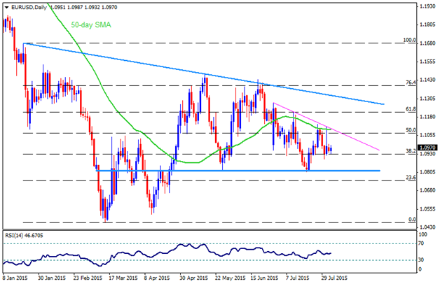EURUSD While short-term descending trend-line resistance, coupled with the 50-day SMA, seems restricting near-term up-move by the EURUSD, signaling
