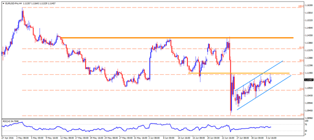 On Tuesday, the EURUSD managed to print more than a week’s high and confronts the 1.1185-90 horizontal area, which if broken can extend the pair’s present up-move, as indicated by short-term ascending trend-channel, to the 1.1220-25, comprising the upper-line of the mentioned channel. However, near overbought RSI levels might restrict the pair’s upside beyond 1.1225 and can trigger a pullback. Given the pair surpasses the 1.1225, it can quickly rise to 1.1300 round figure prior to challenging the 61.8% Fibonacci Retracement of its May – June plunge, around 1.1350. Should the pair witnesses a pullback from current levels, 1.1115 and the 1.1090 channel support level might again come into play, breaking which chances of its fresh downside to 1.1030 & the 1.1000 mark can’t be denied. Further, pair’s additional weakness below 1.1000 can force it to revisit the referendum-day lows around 1.0910.