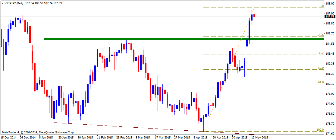 Technical Outlook - GBPJPY, GBPNZD, GBPAUD and GBPCADAfter decisively clearing an important resistance near 185.00 mark, the pair move sharply higher above 188.00 mark to test its highest level for 2015. The pair, however, seems to be facing resistance at higher levels. On the immediate downside, the pair seems more likely to hold 187.00 mark support. Failure to hold 187.00 support could extend the corrective move initially towards 186.00 intermediate support and eventually towards the very important resistance break point now turned immediate strong support near 185.00 mark, also coinciding with 23.6% Fib. retracement level of the pair’s up-swing from April lows to Wednesday’s high touched earlier during the day. Meanwhile, sustained trade above 188.00 mark now seems to pave way for an immediate up-move towards 190.00 psychological mark, which could further get extended towards its next major resistance near 192.00 region.