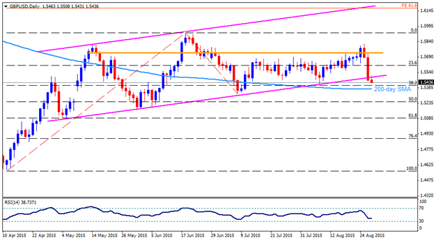 Although, the GBPUSD managed to close above 1.5730 horizontal mark on Monday, upbeat consumer confidence and durable goods orders provided considerable strength to the greenback during Tuesday and Wednesday, pulling back the pair towards breaking the short-term ascending trend-channel support. However, 200-day SMA, presently near 1.5370, can restrict the pair’s immediate declines, breaking which 50% Fibo of April-June up-move, near 1.5250, and the 1.5180-70 are likely consecutive supports that the pair can witness during its extended downward trajectory. Should the pair manages to close below 1.5170, it can quickly plunge to 1.4900 area while 1.5100 – 1.5080 and the 1.4980-75 can act as an intermediate rest for the pair. Alternatively, a close above 1.5530 negates the recent break, fueling the pair towards 23.6% Fibo, near 1.5600 round figure mark prior to targeting 1.5730 and the 1.5800 resistances. Moreover, a sustained up-move beyond 1.5800 area could pave the way for pair’s surge towards June highs, the 1.5930, breaking which channel resistance and the 61.8% FE of the said move, near 1.6170-75 area, is likely restricting extended rise by the pair.