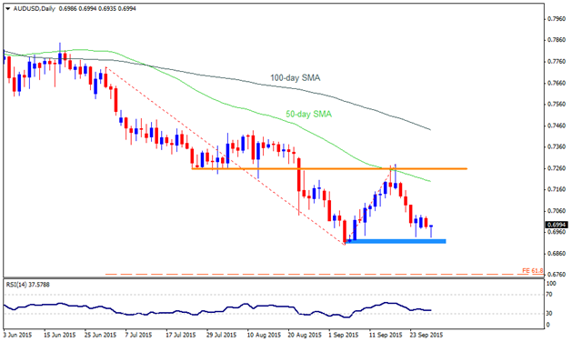 Following its failure to break 0.7250-60 horizontal resistance and 50-day SMA, the AUDUSD currently aims to re-test 0.6920 – 0.6900 broad support area. Should the pair manage to close below its 0.6900 round figure mark, chances of its plunge to 0.6750, including 61.8% FE of its July – September decline, can’t be denied; however, 0.6800 and the 0.6850 area likely intermediate supports during its downturn. Alternatively, 0.7040, 0.7115 and the 50-day SMA, presently near 0.7200, are likely immediate resistances that the pair needs to tackle in order to re-test 0.7250-60 horizontal resistance-zone. Further, successful break of 0.7260 can quickly fuel the pair’s up-move towards 0.7350 and the 100-day SMA, near 0.7440-50 resistance area.
