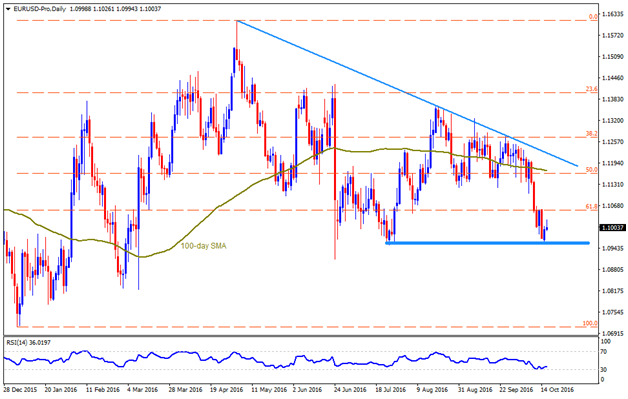 EUR/USD Even if the US Dollar strength dragged EURUSD to nearly three-month lows, the pair bounced-off from 1.0960-50 horizontal support and is presently