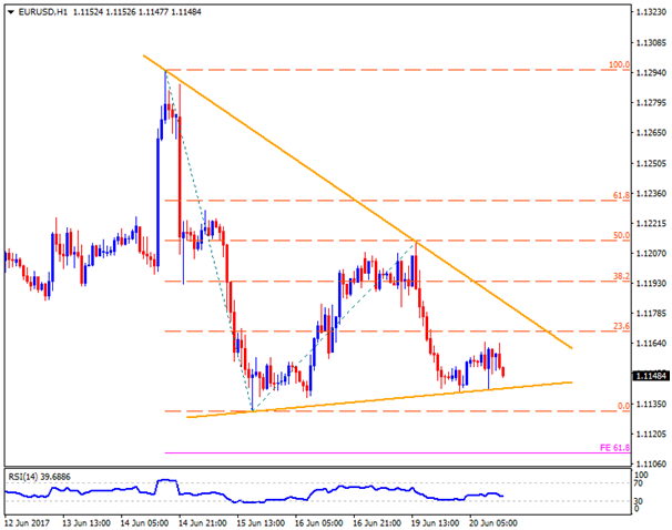 Following its bounce from an immediate trend-line support, at 1.1140 now, the EURUSD might head towards a week-long downward slanting TL, around 1.1180, which could limit the pair’s short-term upside. In case if the quote surpasses 1.1180, it may not respect the 1.1200 round-figure and can aim for 1.1230 resistance-mark, which if broken enable Bulls to target the 1.1260, the 1.1280 and the 1.1300 consecutive numbers to north. On the downside, a clear break of 1.1140 can fetch prices to 1.1130 and then to the 61.8% FE level of 1.1110 before flashing 1.1100 on the chart. Given the pair’s sustained trading below 1.1100, the 1.1080 and the 1.1050 may entertain sellers.
