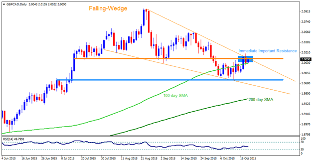 Following its bounce from 1.9750-30 important horizontal support, also including lower line of the “Falling-Wedge” bullish formation, the GBPCAD rallied towards the highest level in nearly three weeks; however, resistance line of the formation, coupled with 2.0100 – 2.0120 horizontal resistance, limited the pair’s further advance. The pair now struggles between the 2.0100 – 2.0120 immediate important resistance and 100-day SMA support, presently at 2.0020. Though, considering the nearness to BoC meeting, chances are higher that the pair breaks the 2.0120 mark and could rise to 2.0440-50 resistance area. Should the pair manage to sustain its up-move beyond 2.0450, it becomes capable enough to challenge 2.0550 and the 2.0700 upside levels prior to targeting the August highs of 2.0970. On the downside, a dip below 2.0020 can quickly pull the pair to 1.9860-50 support-zone, breaking which the mentioned 1.9750-30 and the formation support, currently at 1.9650 are likely important levels that could limit the pair’s downside. Given the pair’s inability to hold 1.9650, it becomes vulnerable to plunge towards 200-day SMA, near 1.9400 round figure mark.