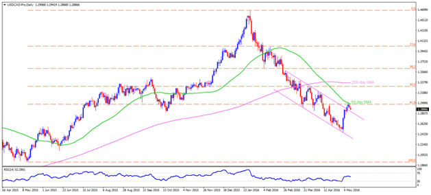 Even if the USDCAD managed to clear two-month old descending trend-channel during late last week, the pair failed to extend the breakout beyond 50-day SMA and 61.8% Fibonacci Retracement of its May 2015 – January 2016 upside and is currently witnessing a pullback towards channel resistance-turned-support re-test, at 1.2850. If the pair drops into the channel, the 1.2755-50 and the 1.2690 are likely consecutive support numbers that it could witness prior to visiting the 1.2590 and the 1.2500 levels. However, the channel-support, near 1.2370, might limit its further downside below 1.2500 round figure mark. Should the pair reverses from the present levels, the 1.2970-75 resistance confluence can continue holding its short-term upside captive, which if broken needs a closing confirmation above 1.3000 psychological magnet to propel the pair towards 1.3160 and the 1.3200 resistance levels. Moreover, pair’s successful trading above 1.3200 enables it to challenge the 50% Fibo level of 1.3300 and the 1.3360 mark, comprising 200-day SMA.