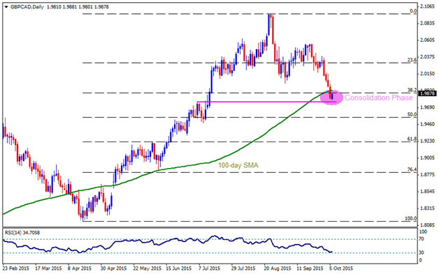 GBPCAD Having breached its 100-day SMA and 38.2% Fibonacci Retracement of April – August advance, near 1.9920 – 1.9900 area, the 1.9780-70 support-zone,