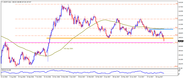 One after the other Geo-political threats, be it emanating from North Korea or from US hurricanes, have been helping the JPY to maintain its strength. As a result, the USDJPY finally broke 108.40-15 broad support-zone and indicates brighter chances of testing 107.00–106.90 horizontal-line. In case if overbought RSI fails to trigger the pair’s pullback around 106.90, the 106.50 and the 105.90 could come-back on the chart, while a break of 105.90 might please Bears with 105.30 and the 104.60 supports. Alternatively, 107.80 and the 108.40 could play their role as immediate support-turned-resistances, surpassing them might trigger the pair’s recovery in direction to 109.30 & 109.80 levels. During the quote’s additional upside beyond 109.80, the 110.50 can act as intermediate halt ahead of reigniting the importance of 111.00 – 111.20 area, comprising 100-day SMA.