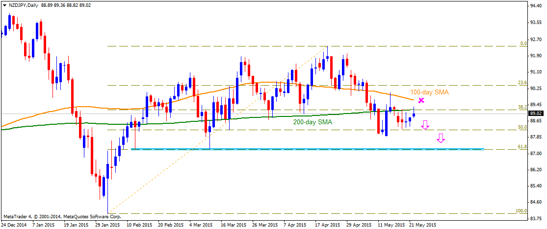 Following the pair’s weakness back below 100-day SMA and a subsequent drop below 200-day SMA, the pair seems to have found some support near 88.00 mark, nearing 50% Fib. retracement level of Feb. to April 2015 up-swing. The pair, however, is now facing resistance at 200-day SMA, currently near 89.20-30 zone, also coinciding with 38.2% Fib. retracement level. A move above 200-day SMA resistance now seems to face strong headwind at 100-day SMA, currently near 89.70-80 zone, which now seems to cap near-term up-move for the pair. Meanwhile, a drop back below 88.60-50 zone now seems to trigger the required momentum to drag the pair back below 88.00 mark towards testing a very important support near 87.20-87.00 area, representing 61.8% Fib. retracement level. Until the pair continues trading below 200-day SMA it seems vulnerable to test lower level. However, a decisive move above 200-day SMA and a subsequent strength above 100-day SMA might negate the short-term bearish outlook for the pair.
