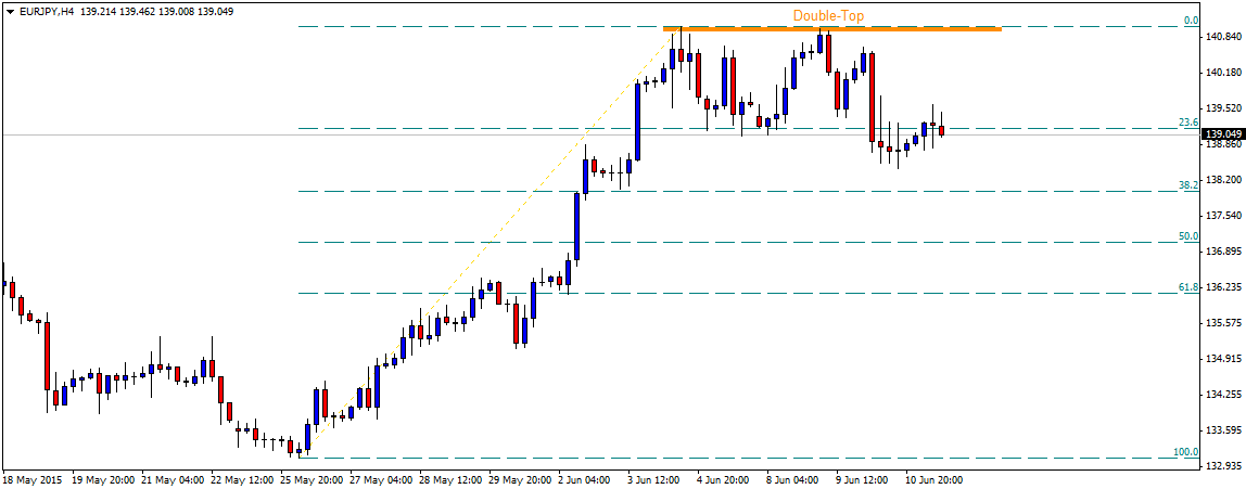 Technical Update - JPY PairsOn 4-hourly chart, the pair already seems to have confirmed a bearish Double-top chart pattern by decisively breaking below 139.00 mark support representing 23.6% Fib. retracement level of its up-swing from May low to highs touched in June. Hence, from current levels the pair seems more likely to resume its corrective move, initially towards retesting 138.40-30 intermediate horizontal support, before eventually dropping to 138.00 mark support representing 38.2% Fib. retracement level. Considering the confirmation of the bearish chart pattern, the pair might continue drifting lower in the near-term towards testing 50% Fib. retracement level support near 137.00 mark, which also coincides with the expected downfall of the Double-top chart pattern. Meanwhile on the upside, 139.50-60 horizontal area now seems to provide immediate resistance. Although a move above this immediate resistance might lift the pair back above 140.00 mark psychological resistance, but any up-move beyond 140.00 is likely to be restricted near 140.50-60 strong resistance area. A decisive move above 140.50 resistance might negate the near-term bearish outlook for the pair, thus boosting the pair beyond 141.00 mark strong resistance.