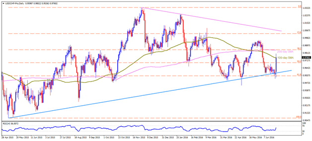 USD/CHF While a year-long upward slanting trend-line confined the USDCHF downside, the Brexit decision propelled the pair towards the month’s high;