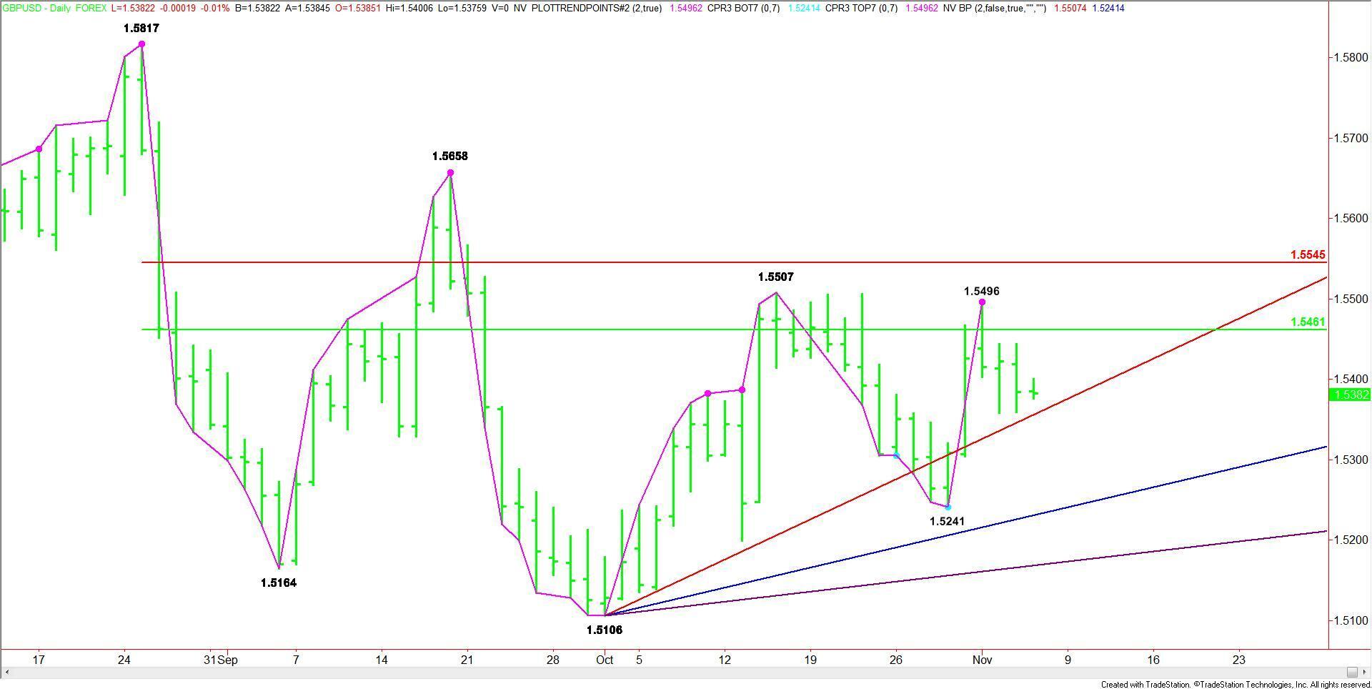 The daily chart shows the GBP/USD in a downtrend. Since early October, the Forex pair has run into resistance inside a major 50% to 61.8% zone at 1.5461 to 1.5545, forming two main tops at 1.5496 and 1.5507.
