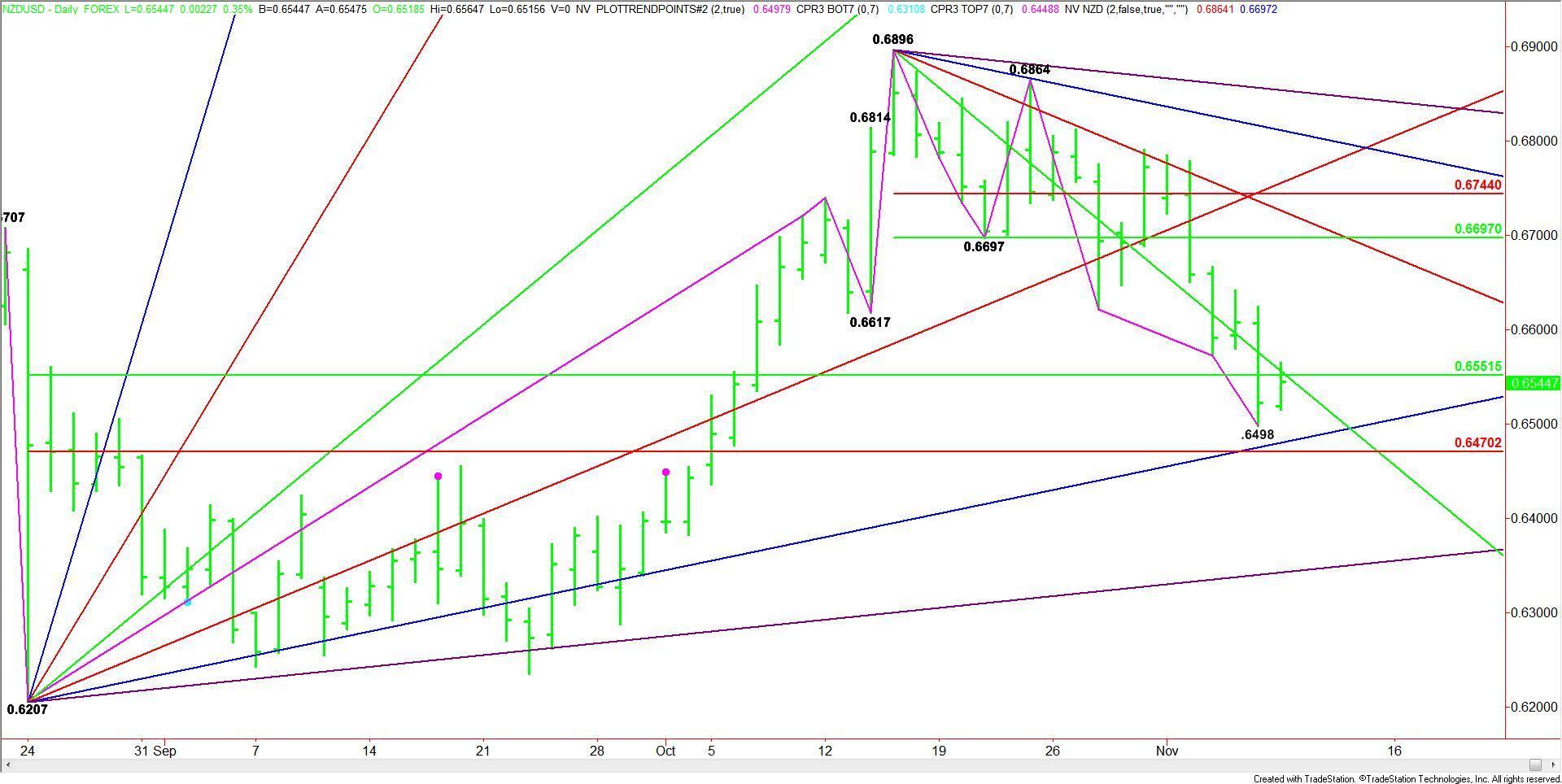 The main trend is down according to the daily swing chart. The main range is .6207 to .6896. Its retracement zone is .6551 to .6470. Last week’s low was .6498. Currently, the NZD/USD is testing the 50% level at .6551.