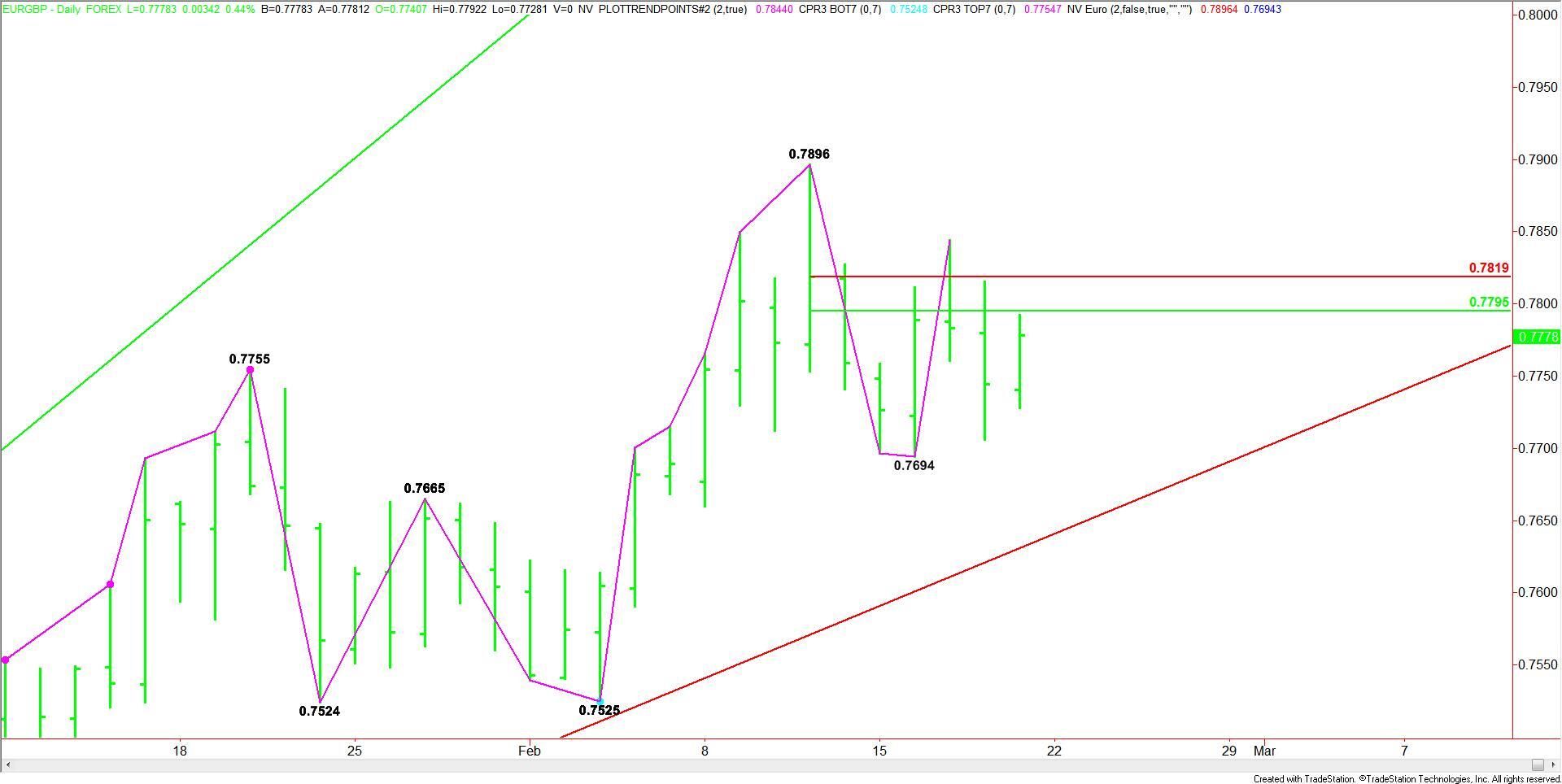 The EUR/GBP is also showing signs of strength with the market consolidating above the recent low at .7694, but below the key retracement zone at .7795 to .7819.