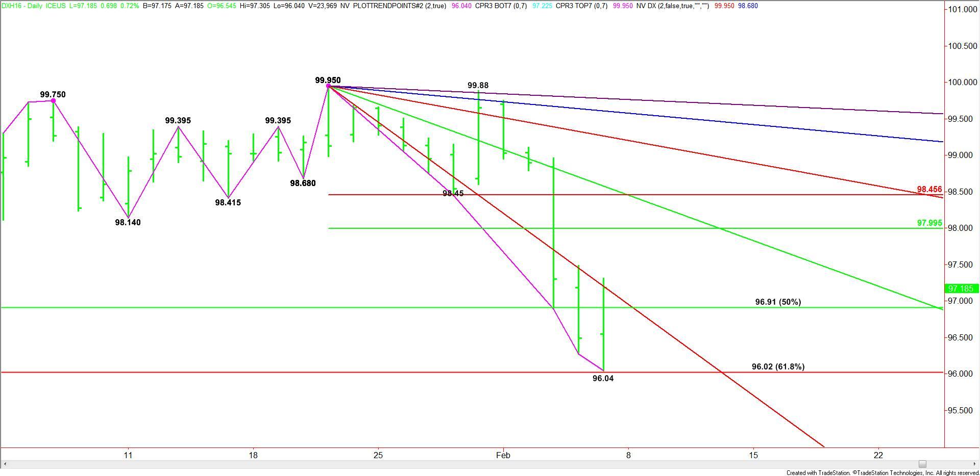 The subsequent rally blew out short-sellers who took positions earlier in the week. The initial rally took out the major long-term 50% level at 96.91. Upside momentum eventually drove the index through a steep downtrending angle at 97.20, but the rally stopped at 97.305 and broke back towards support.