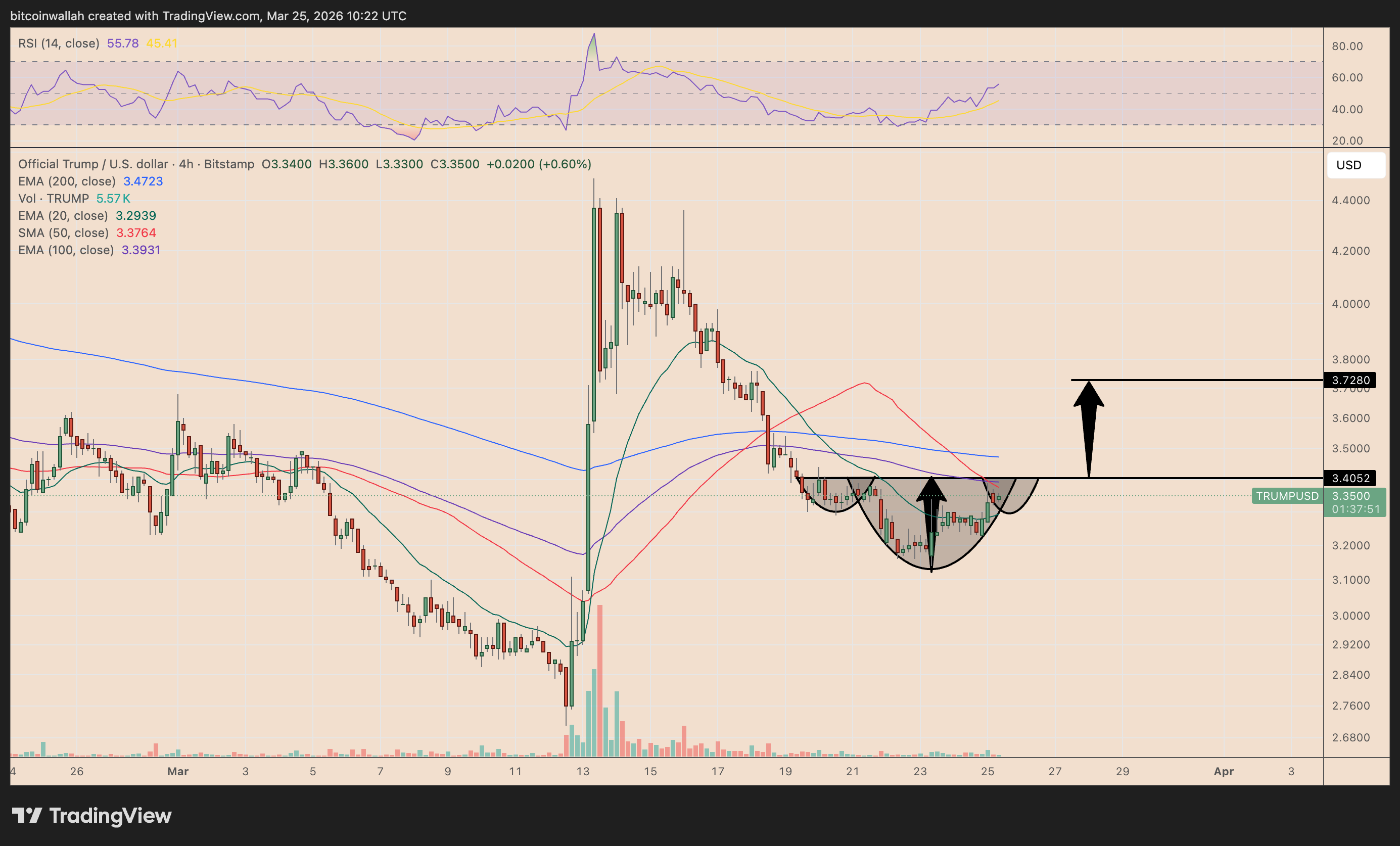 TRUMP appears to be carving out an inverse head-and-shoulders pattern on the 4-hour chart, a setup that typically signals a bullish reversal after a downtrend.