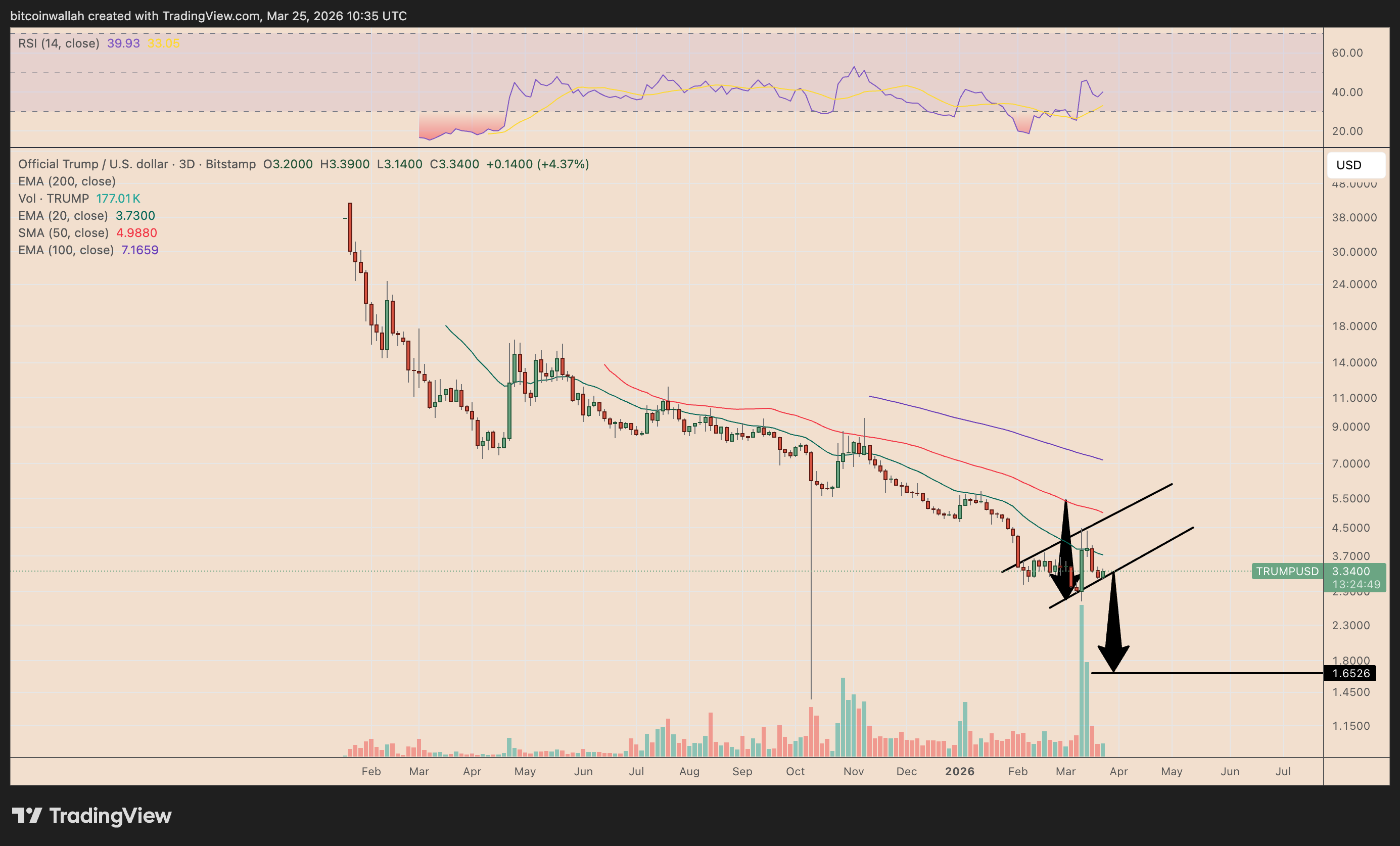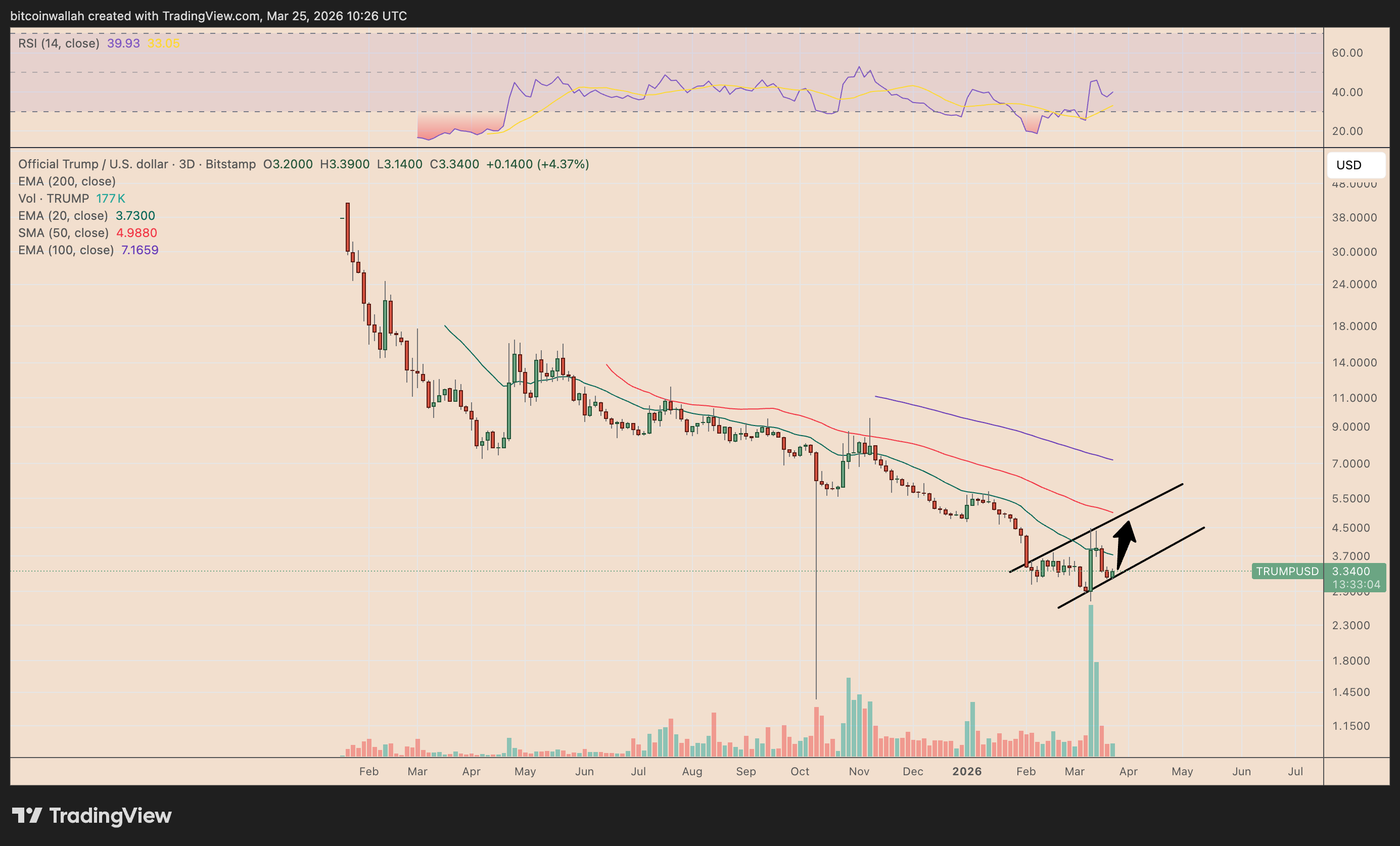 On the 3-day chart, TRUMP is also attempting a recovery within a falling-channel structure that resembles a bull flag developing after its sharp March rebound.