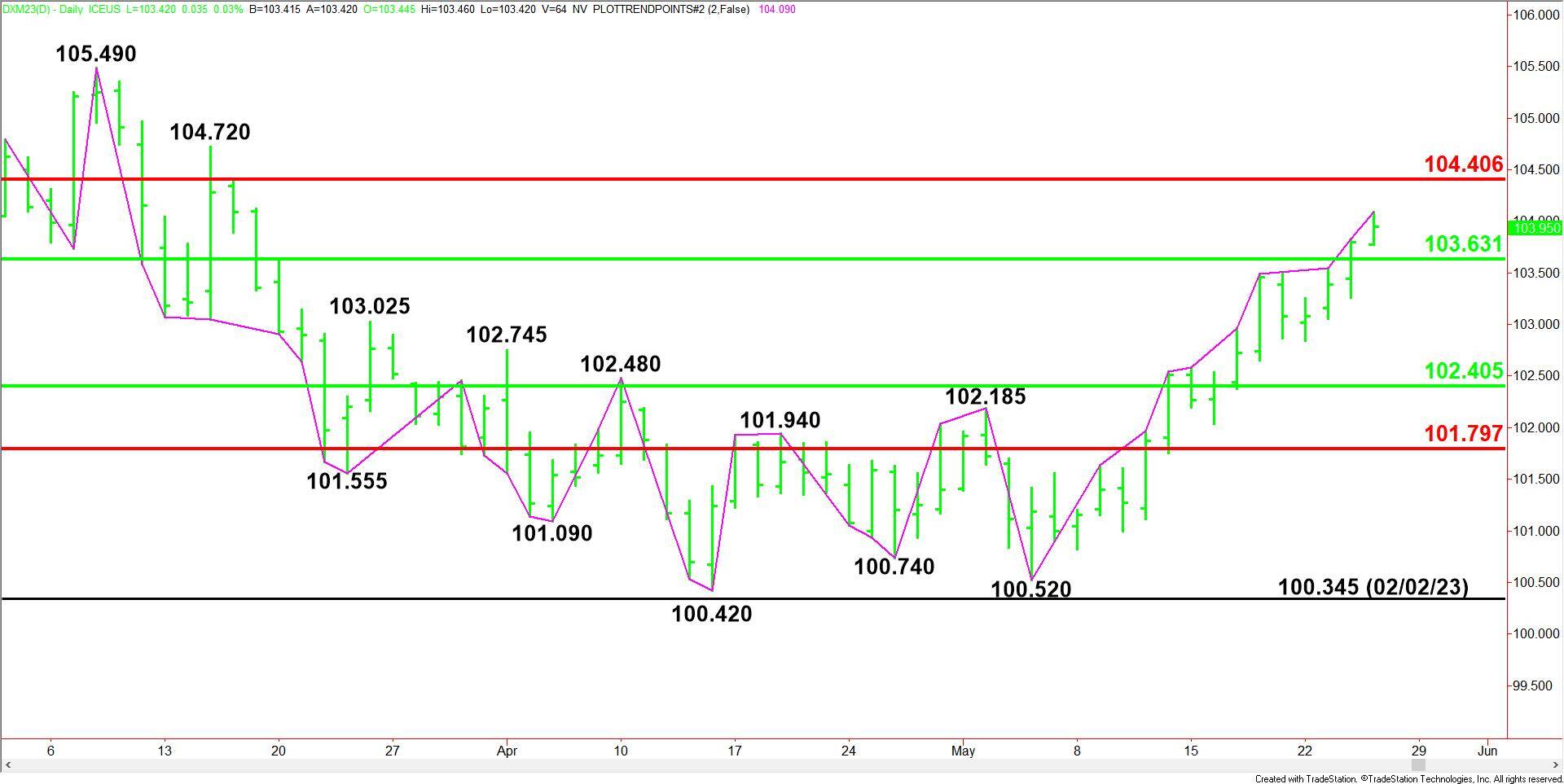 At 08:41 GMT, June US Dollar Index futures are trading 103.420, up 0.025 or +0.03%. On Wednesday, the Invesco DB US Dollar Index Bullish Fund ETF (UUP) settled at $28.48, up $0.11 or +0.39%.