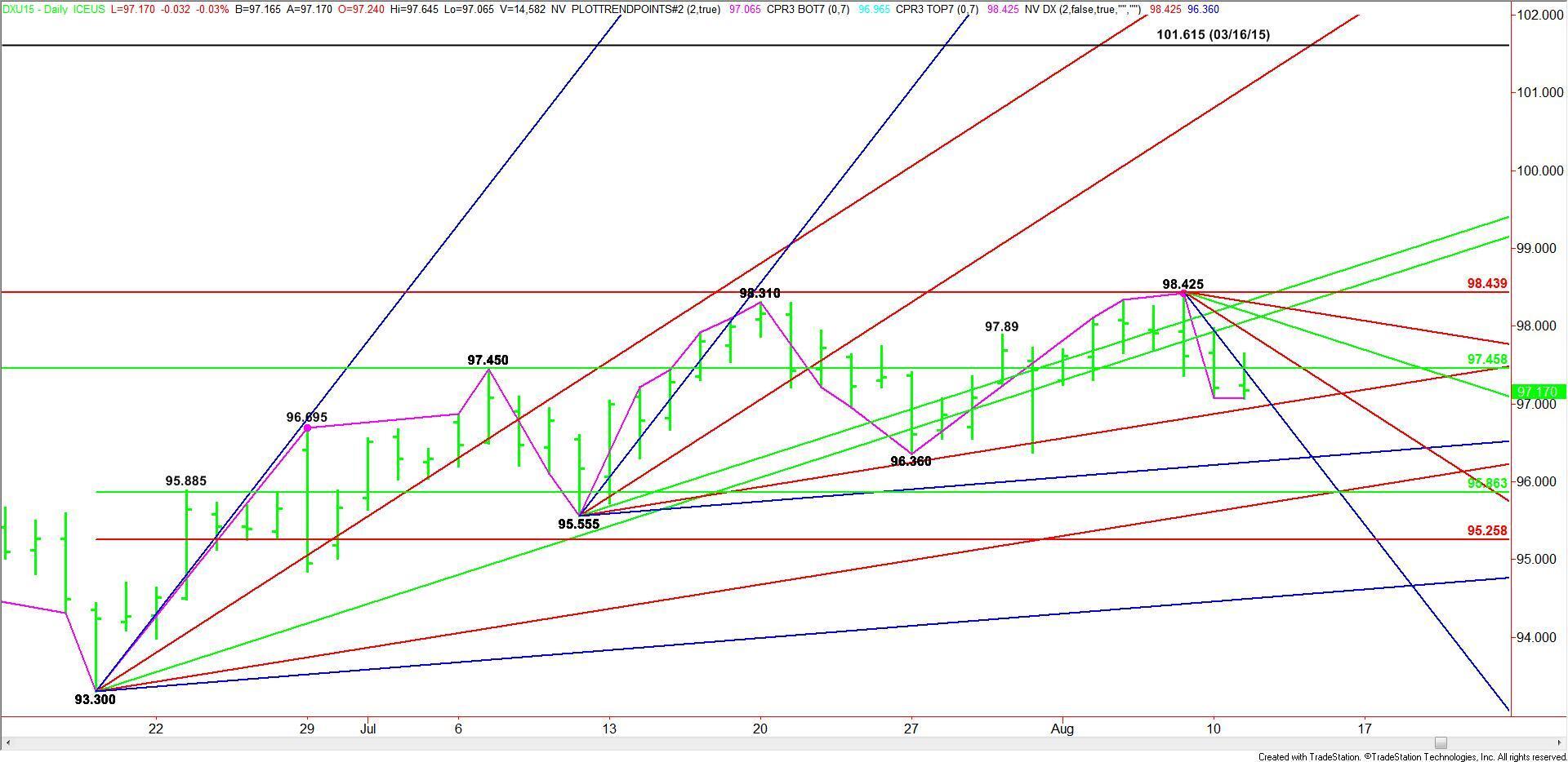 Today’s regular session is likely to begin on the weak side of a major 50% level at 97.46. This level is the first potential resistance. Any rally over this level is likely to be labored because of several downtrending and uptrending angles in front of the next major Fibonacci resistance at 98.44.