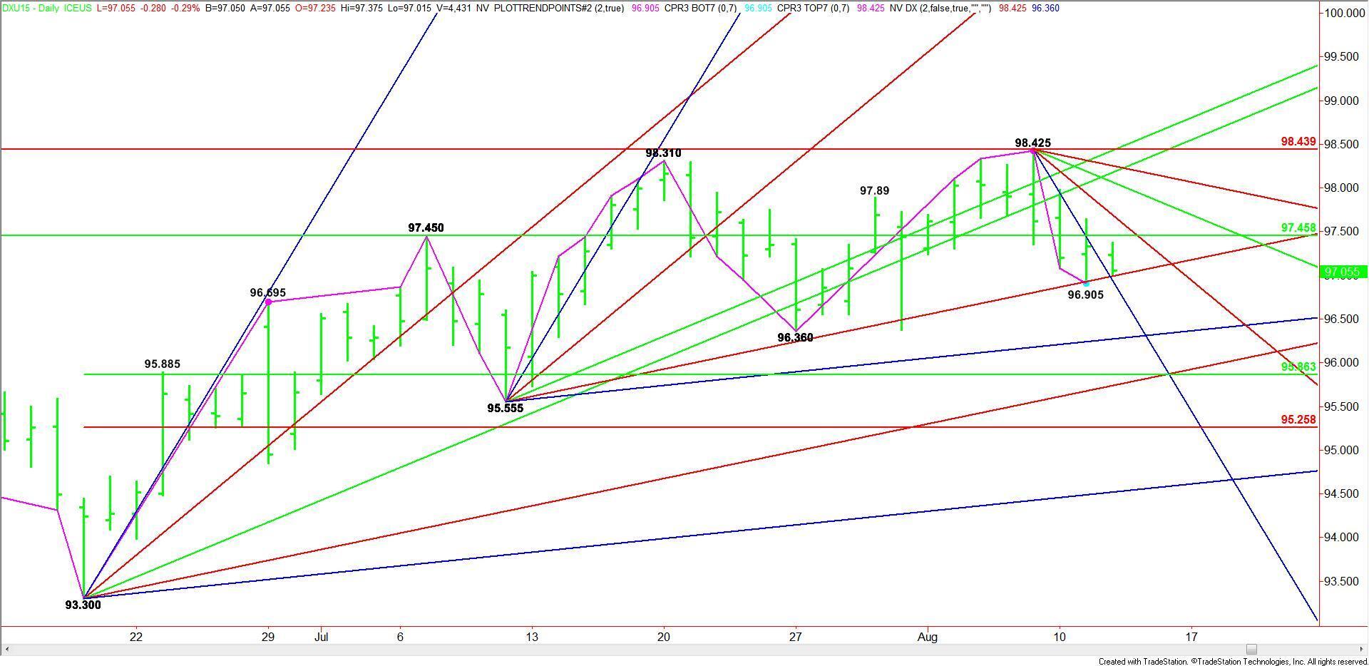 September U.S. Dollar Index futures broke sharply early in the session on Tuesday, but the market rebounded to close higher after testing an uptrending Gann angle. It wasn’t a major reversal, however, since the market had been down only two days from a top. Overnight, there was no follow-through to the upside so the chart pattern wasn’t confirmed. This indicates that sellers are still in control.