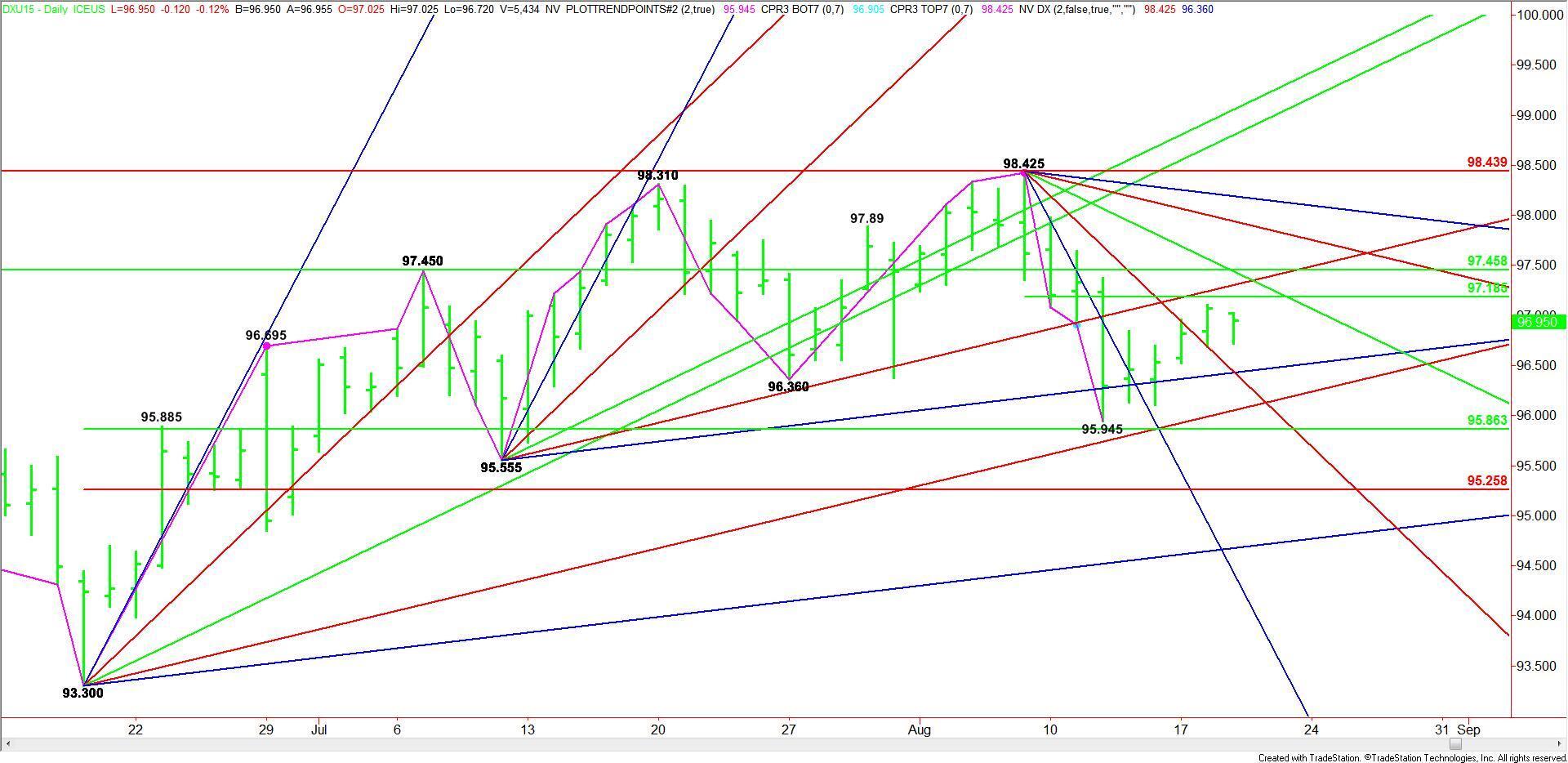The main trend is down according to the daily swing chart. The short-term range is 98.425 to 95.945. Its mid-point or pivot at 97.185 is controlling the short-term direction of the market. Trader reaction to this level will tell us whether the bulls or the bears are in control.