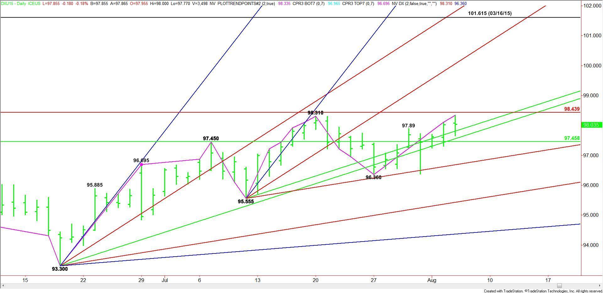 The next two days are likely to feature increased volatility because of today’s BoE meeting and Friday’s U.S. Non-Farm Payrolls report. Be prepared to be active. Have a strategy. The direction of the market today and Friday is likely to be determined by trader reaction to the Fibonacci level at 98.44. Treat this level like a pivot.