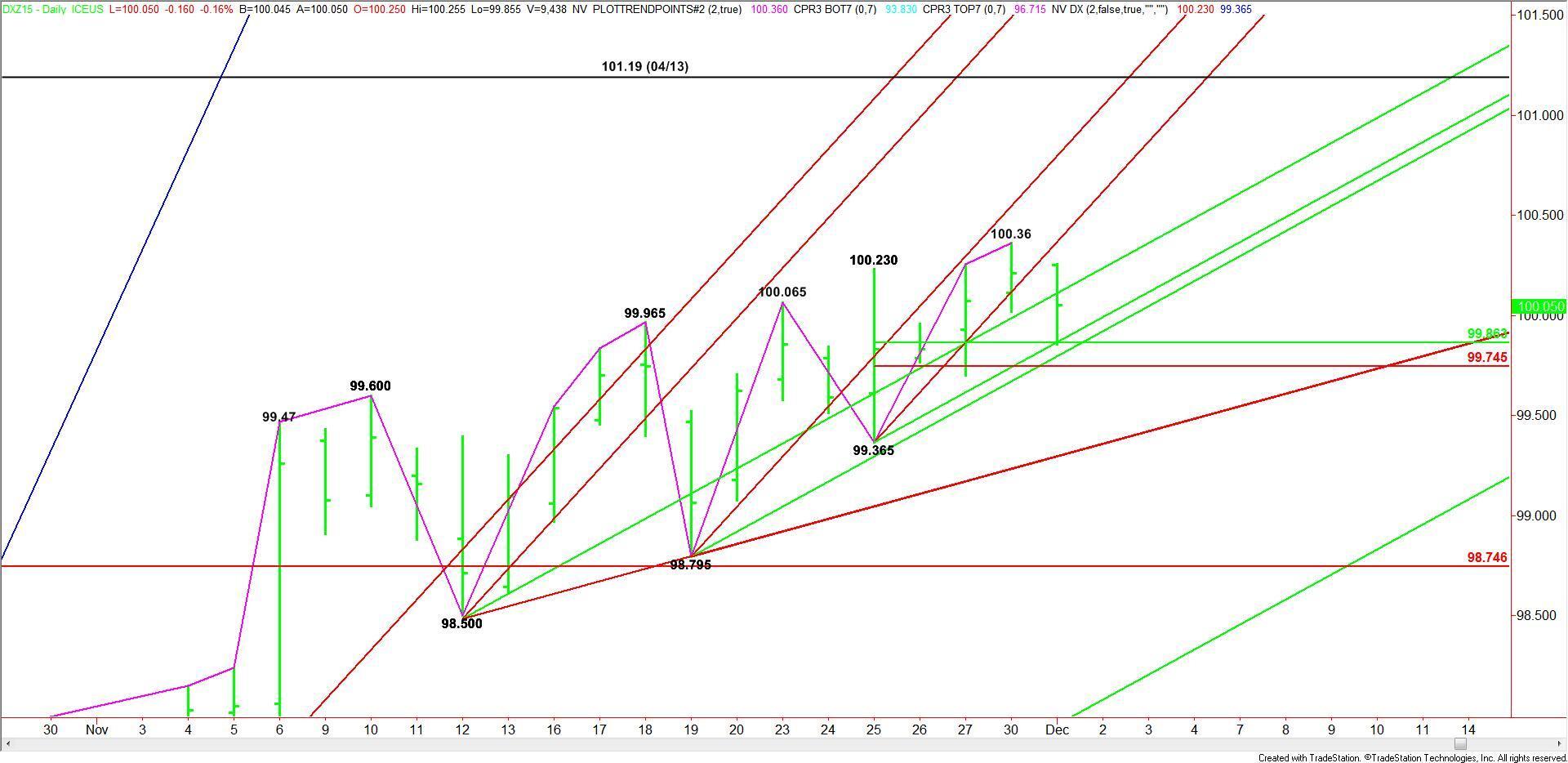 The main trend is up according to the daily swing chart. The new short-term range is 99.365 to 100.36. Its retracement zone is 99.86 to 99.74. Earlier in the session, the index found support on the 50% level at 99.86.