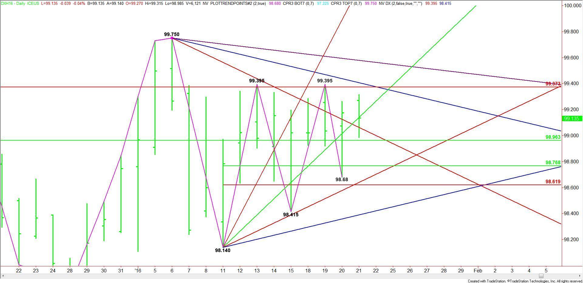 March U.S. Dollar Index futures are trading slightly lower shortly before the cash market opening. The early price action suggests trader indecision. The market is also trading inside the major retracement zone defined as 98.96 to 99.37. It has been trading inside this zone for several days. This indicates investor indecision. However, investor reaction to this zone will determine the longer-term direction of the market.