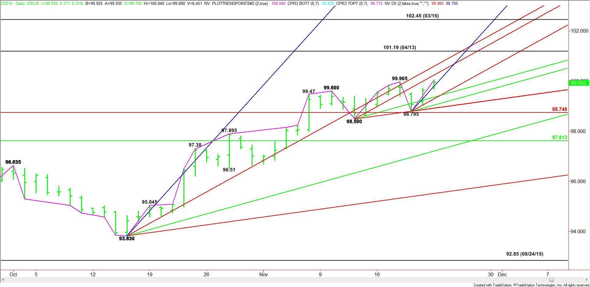 December U.S. Dollar Index futures followed through to the upside after Friday’s strong close. The buying was strong enough to take out the previous main top at 99.965, signaling a resumption of the uptrend. It also made 98.795 a new main bottom.