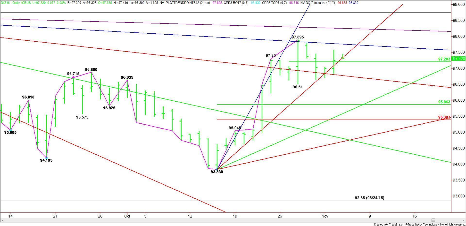 The main trend is up according to the daily swing chart, however, momentum has been to the downside since October 28 with prices consolidating inside the 97.895 to 96.51 range. The mid-point or pivot price of this range is 97.20. This price is essentially controlling the short-term direction of the market.