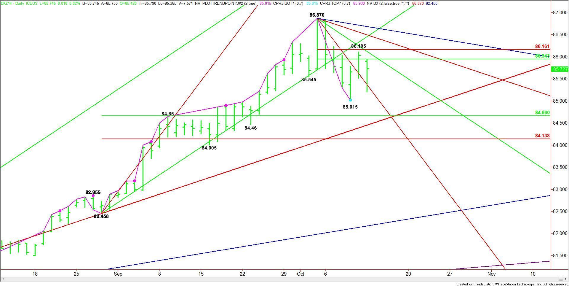 The December U.S. Dollar Index futures contract finished lower on Monday, helping to form a new minor top at 86.105. The short-term range is 86.87 to