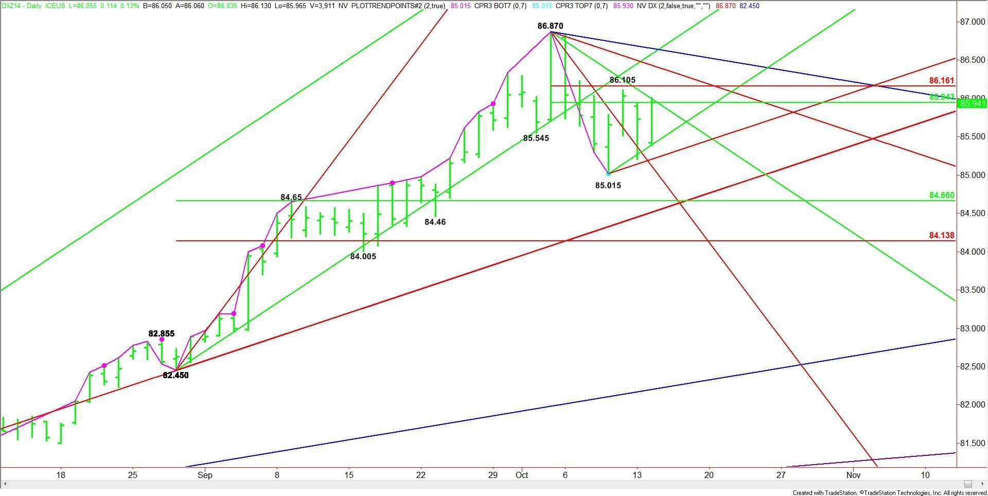 The price action by the December U.S. Dollar Index is starting to suggest bottoming. Once again the market survived an attempt to take out the 85.015 minor bottom. The strong rebound rally into the 50% level at 85.94 and the close at this level is giving the market an upside bias today.