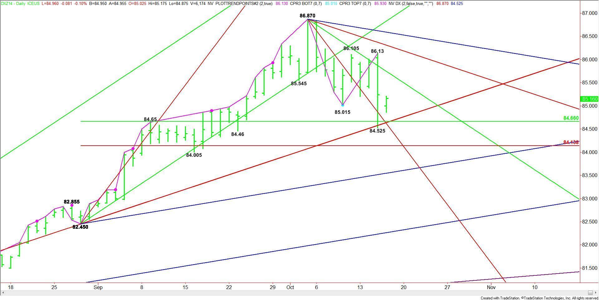 The key area to watch on the downside is a long-term uptrending Gann angle/50% level combination at 84.70 to 84.66. Although the market traded as low as 84.525 earlier in the week, taking out the combination with conviction is likely to trigger an acceleration to the downside with the major Fibonacci level at 84.14 the next likely target.