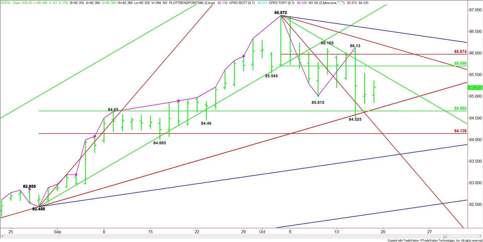 The main range is 82.45 to 86.87. The retracement zone formed by this range is 84.66 to 84.14. This zone stopped the rally last week when the index traded down to 84.525. Since the main trend is down on the daily chart, counter-trend buyers may step in when this zone is being tested.