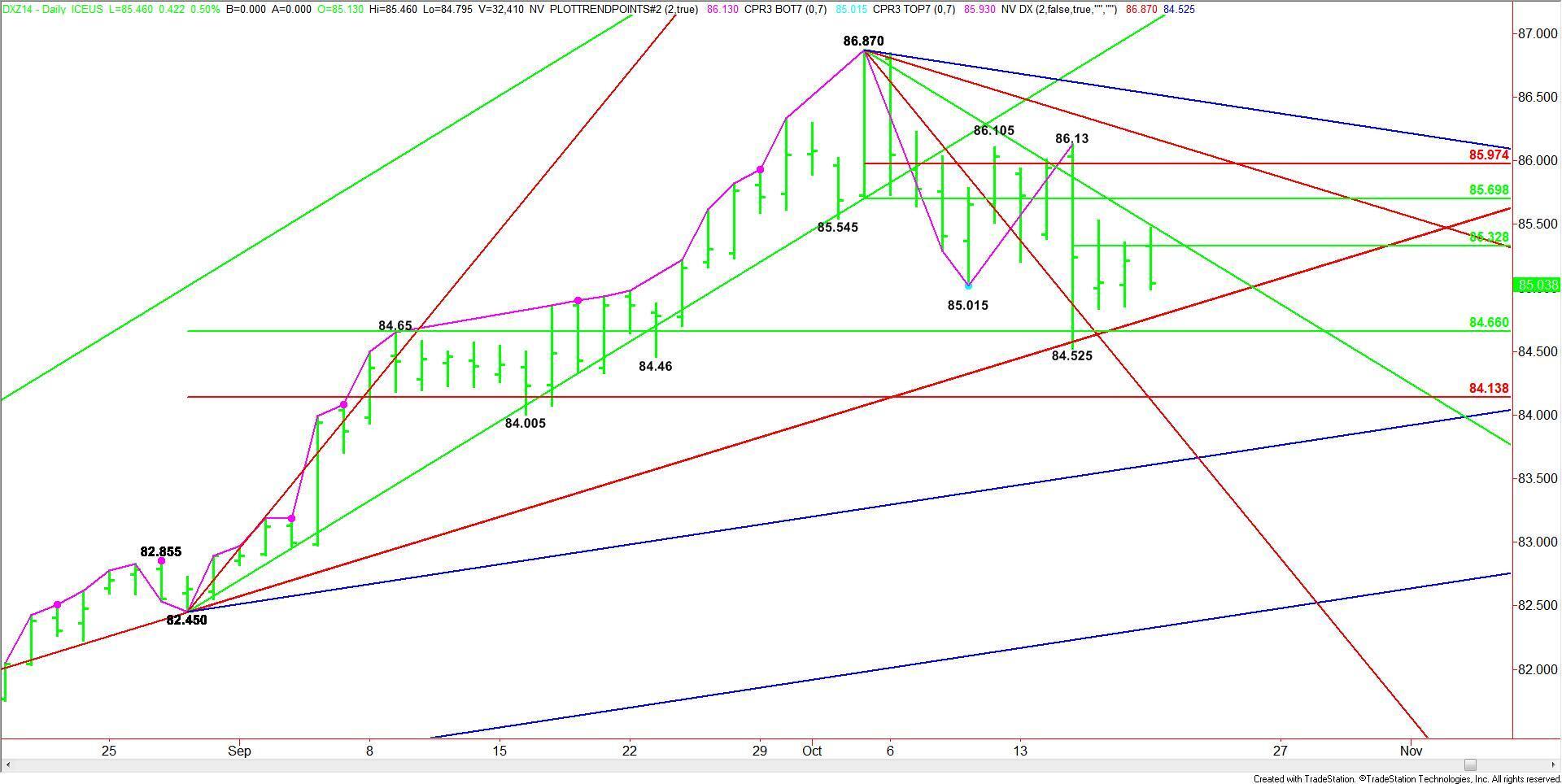 On Monday, the December U.S. Dollar Index continued to trade inside last week’s 86.13 to 84.525 range, but the lower close gives the index an early