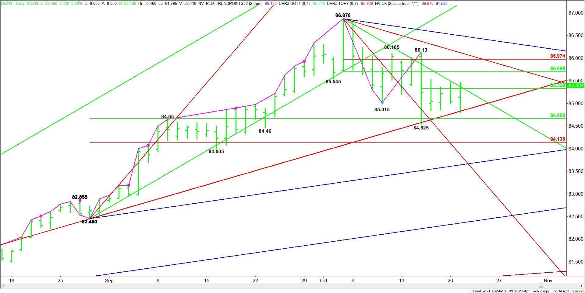 The December U.S. Dollar Index broke early in the session on Tuesday only to find support on a long-term uptrending angle at 84.795. Today, this angle