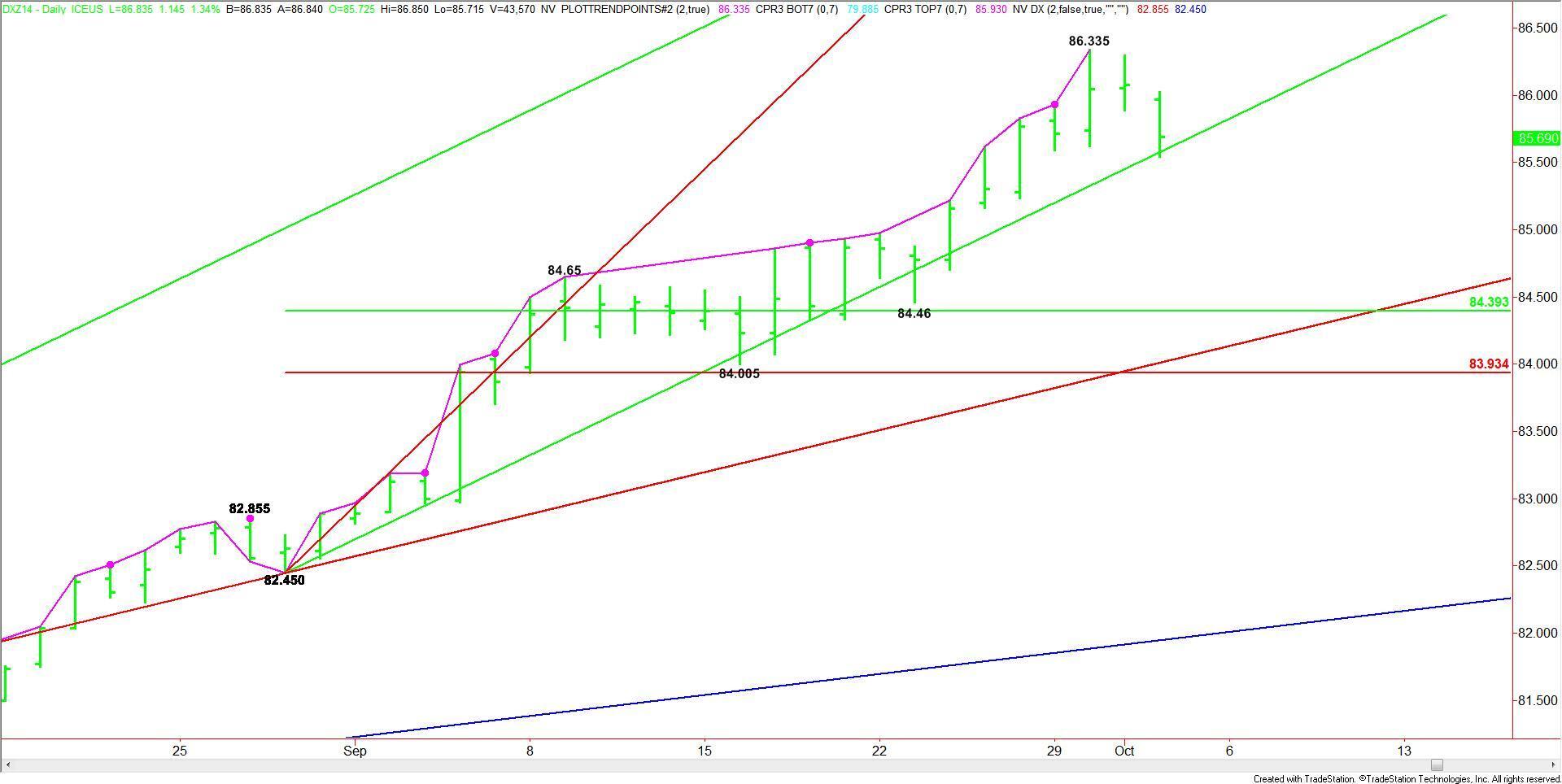 Traders lightened up on their long positions on Thursday ahead of today’s major U.S. Non-Farm Payrolls report. This led to the sell-off that threatened the major uptrending angle that had held as support since the 82.45 bottom on August 28. Taking this angle with conviction would trigger a massive sell-off since the daily chart indicates there is room to fall all the way back to 84.39 to 83.93.