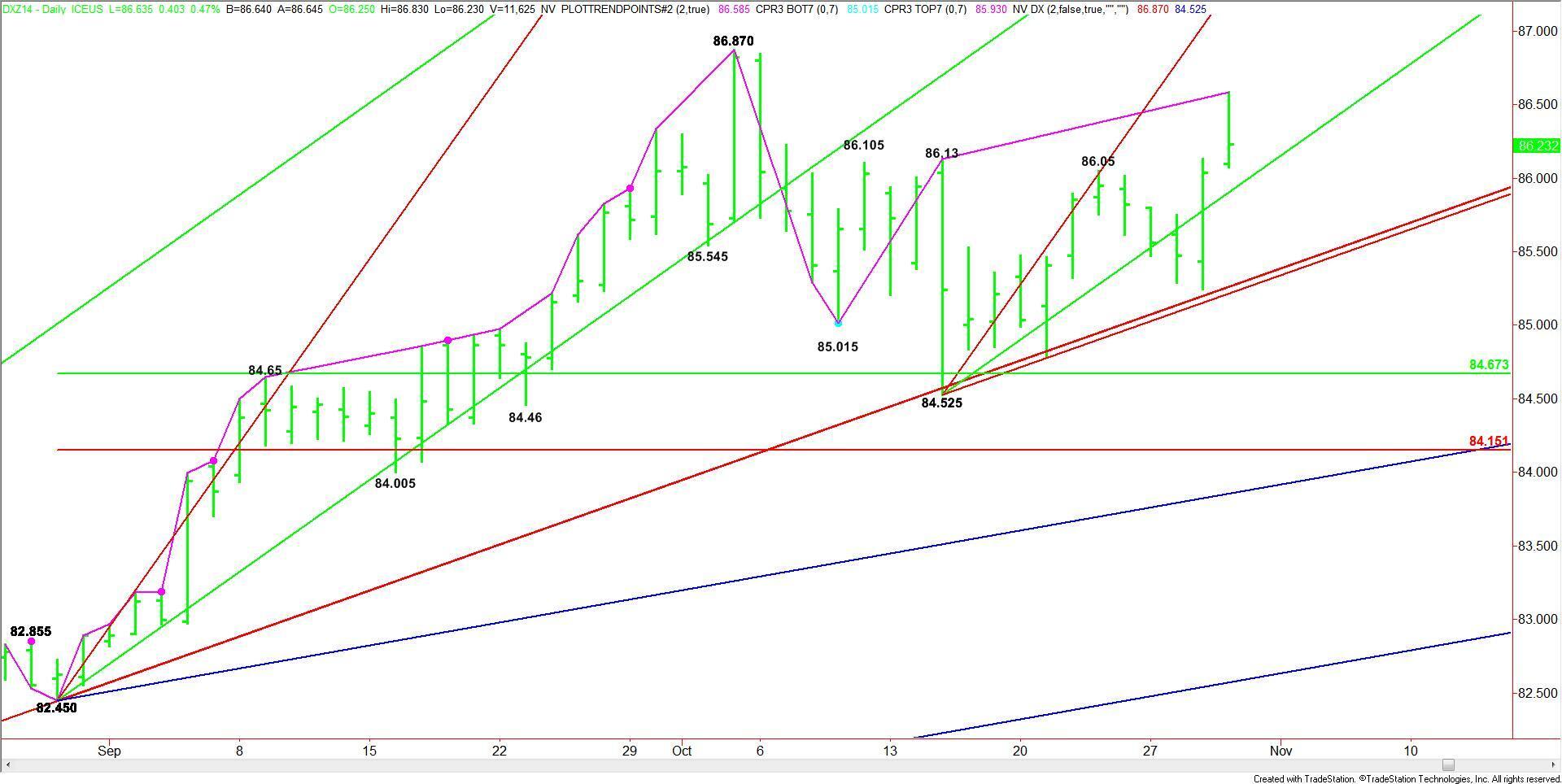 The news triggered a resumption of the uptrend when the index took out the previous main top at 86.87. This price is new support, followed by an uptrending angle at 86.025.