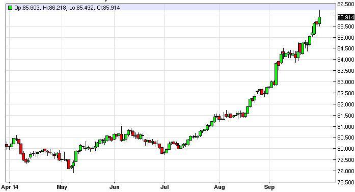 As long as the Federal Reserve looks ready to taper off of quantitative easing, there’s no reason to think that the US dollar won’t continue to strengthen overall. This is especially true against the Euro and Yen, two of the major currencies in this contract. Both look ready to be sold off drastically against the greenback, so we still like this market overall. It is a nice longer-term uptrend that should continue to the 88 handle given enough time, and then possibly even the 90 handle if things stay the way they have been. Selling isn’t even a thought at this point in time.