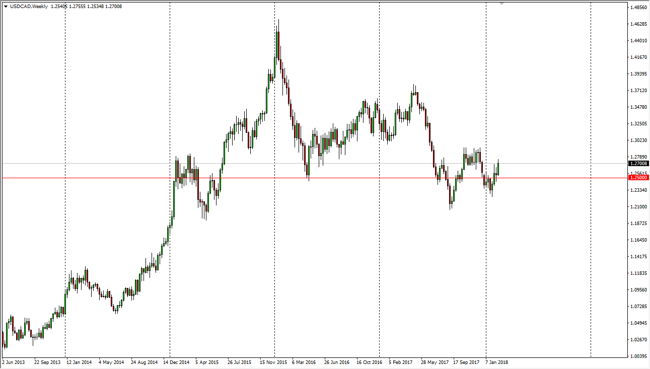 The US dollar has been bullish over the course of the week, meaning that the 1.25 level has continue to attract a lot of attention. This is an area that has previously both been resistive and supportive, so market memory dictates that it will continue to attract attention obviously. I think that if we can break above the 1.30 level, the US dollar should continue to climb towards the 1.35 level, possibly the 1.37 level.