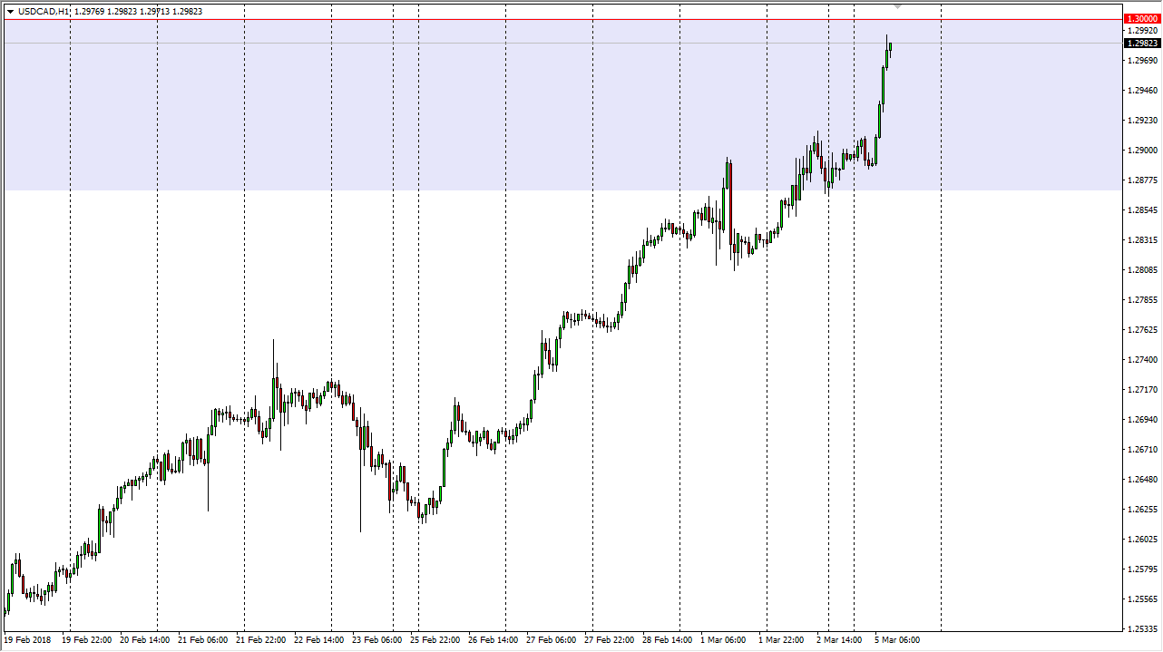 The US dollar has exploded to the upside against the Canadian dollar during the trading session on Monday, reaching towards the vital 1.30 level. If we can break above that level, the market is free to go much higher. However, in the short term we may need to make several attempts to do so.